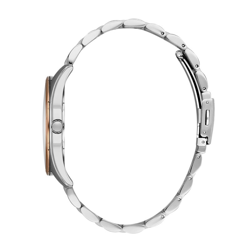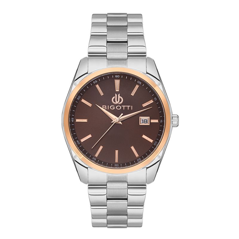 Класически модел мъжки часовник Bigotti с метален корпус и верижка от неръждаема стомана. Кафяв аналогов дисплей с показател за дата, стрелки и индекси в цвят розово злато. Минерално стъкло, устойчиво на надраскване. Задвижва се от кварцов механизъм. Водоустойчивост 5 ATM - допускат се леки пръски и взимане на душ, не се препоръчва обилно мокрене.