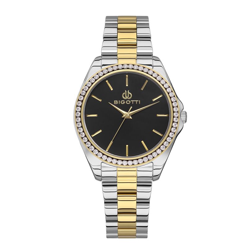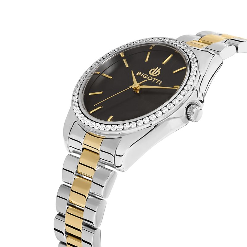 Класически модел дамски часовник Bigotti с нежна декорация от кристали по безела. Черен аналогов дисплей със златисти стрелки и индекси. Минерално стъкло, устойчиво на надраскване. Метален корпус в комбинация с верижка от неръждаема стомана. Моделът се задвижва от кварцов механизъм. Водоустойчивост 3 ATM - допускат се леки пръски, не се препоръчва обилно мокрене.