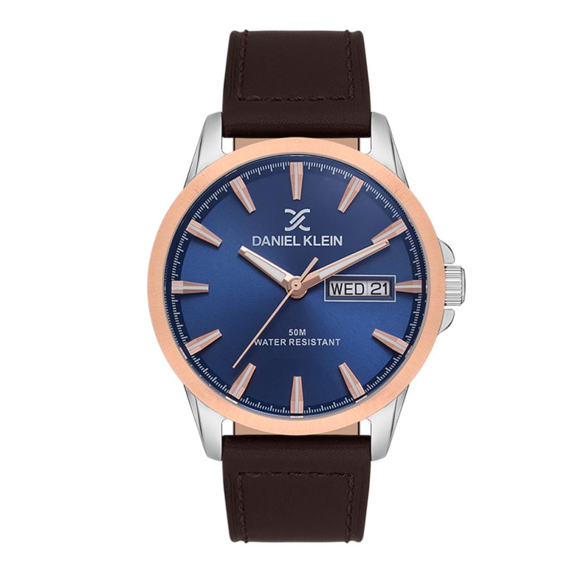 Спортно-елегантен мъжки часовник Daniel Klein от колекцията Premium. Аналогов дисплей с показател за дата и ден от седмицата. Метален корпус в комбинация с каишка от естествена кожа. Минерално стъкло устойчиво към надраскване. Задвижва се от кварцов механизъм. Водоустойчивост 5 ATM - допускат се леки пръски и взимане на душ, не се препоръчва обилно мокрене.