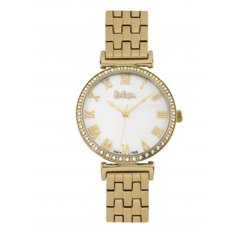 Стилен дамски часовник Lee Cooper от колекцията Elegance. Моделът е с корпус и верижка изработени от специална сплав - супер метал. Стъкло минерал-кристал. Аналогов дисплей със златисти стрелки и римски цифри и декорация от нежни кристали на ринга. Задвижва се от кварцов механизъм. Водоустойчивост 3 ATM - допускат се леки пръски, не се препоръчва обилно мокрене.