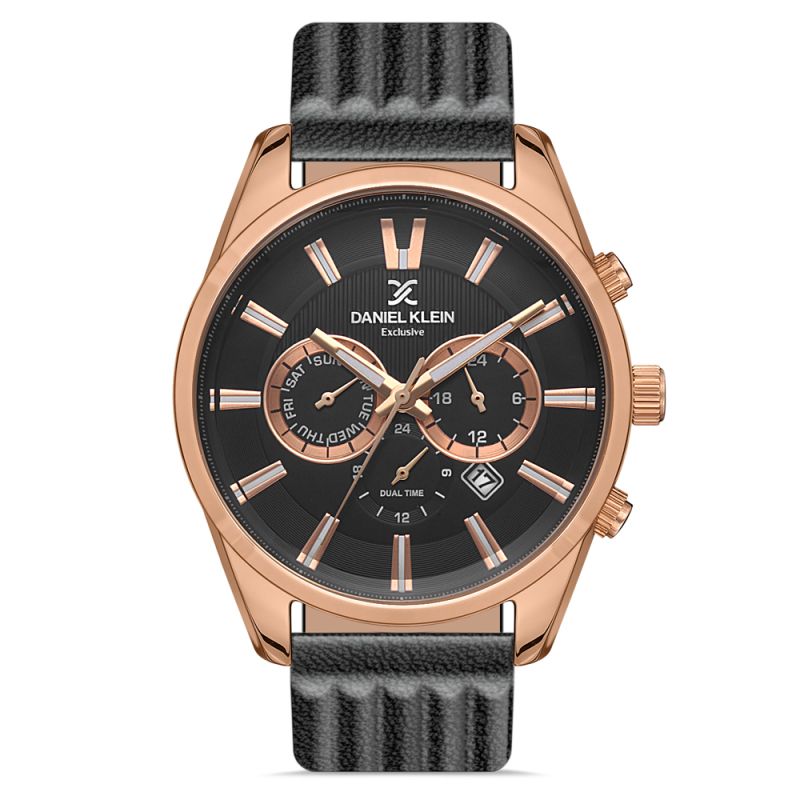 Мъжки часовник Daniel Klein с мултифункционален дисплей от колекцията Exclusive. Моделът е с корпус от метал и черна каишка от естествена кожа. Стъкло минерал-кристал. Кварцов механизъм. Водоустойчивост 5 ATM - допускат се леки пръски и взимане на душ, не се препоръчва обилно мокрене.