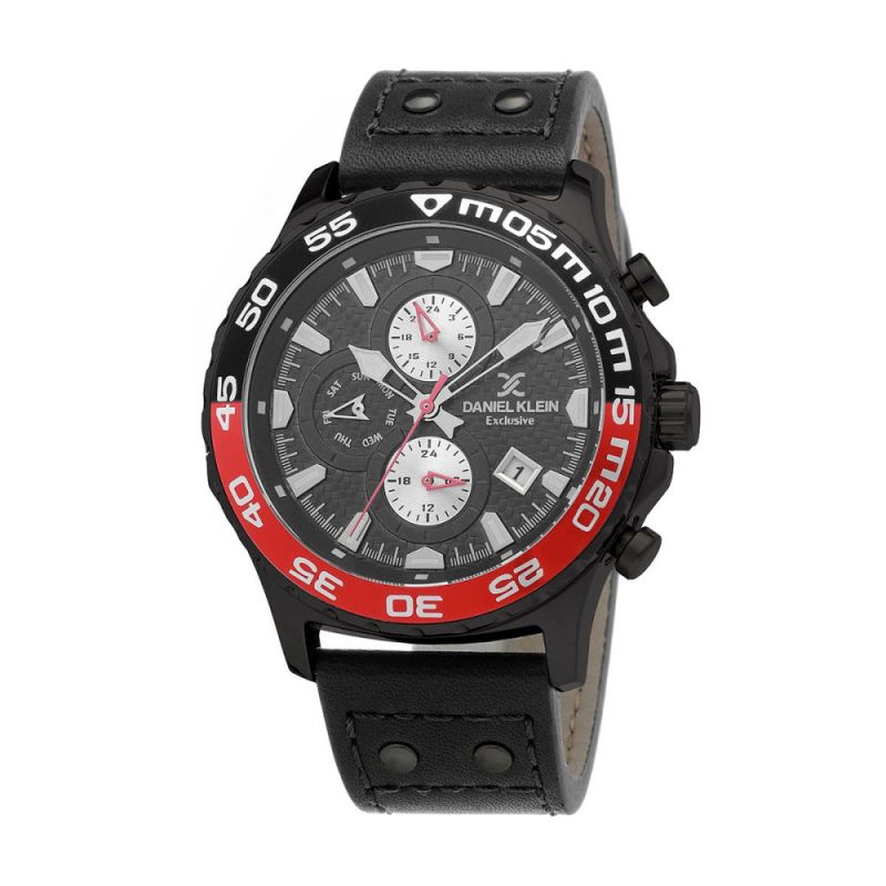 Спортно-елегантен мъжки часовник Daniel Klein с мултифункционален дисплей. Стъкло минерал-кристал. Корпус от висококачествена метална сплав. Черна кожена каишка с нитове. Кварцов механизъм. Водоустойчивост 5 ATM - допускат се леки пръски и взимане на душ, не се препоръчва обилно мокрене.