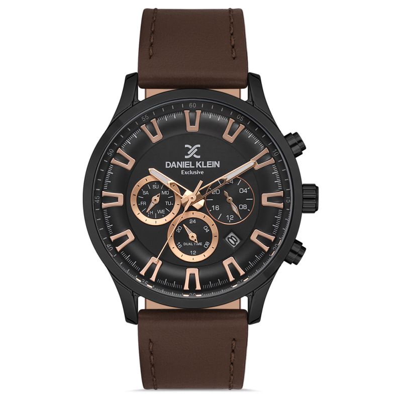 Мъжки часовник Daniel Klein с тъмнокафява кожена каишка от колекцията Exclusive. Корпус от метал. Мултифункционален дисплей с показатели за дата, ден и двойно време. Стъкло минерал-кристал. Кварцов механизъм. Водоустойчивост 5 ATM - допускат се леки пръски и взимане на душ, не се препоръчва обилно мокрене.