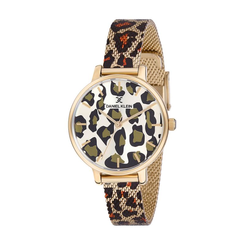 Дамски часовник Daniel Klein с модерна ежедневна визия от колекцията Trendy. Моделът е с леопардов принт на дисплея и верижката. Корпус от висококачествена метална сплав. Стъкло минерал-кристал. Кварцов механизъм. Водоустойчивост 3 ATM - допускат се леки пръски, не се препоръчва обилно мокрене.