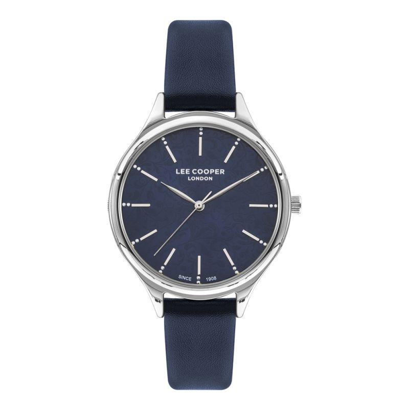 Дамски часовник Lee Cooper със стилна модерна визия. Тъмносин аналогов дисплей с нежна флорална декорация. Стъкло минерал-кристал. Корпус изработен от супер метал. Каишка от естествена кожа. Задвижва се от кварцов механизъм. Водоустойчивост 3 ATM - допускат се леки пръски, не се препоръчва обилно мокрене.