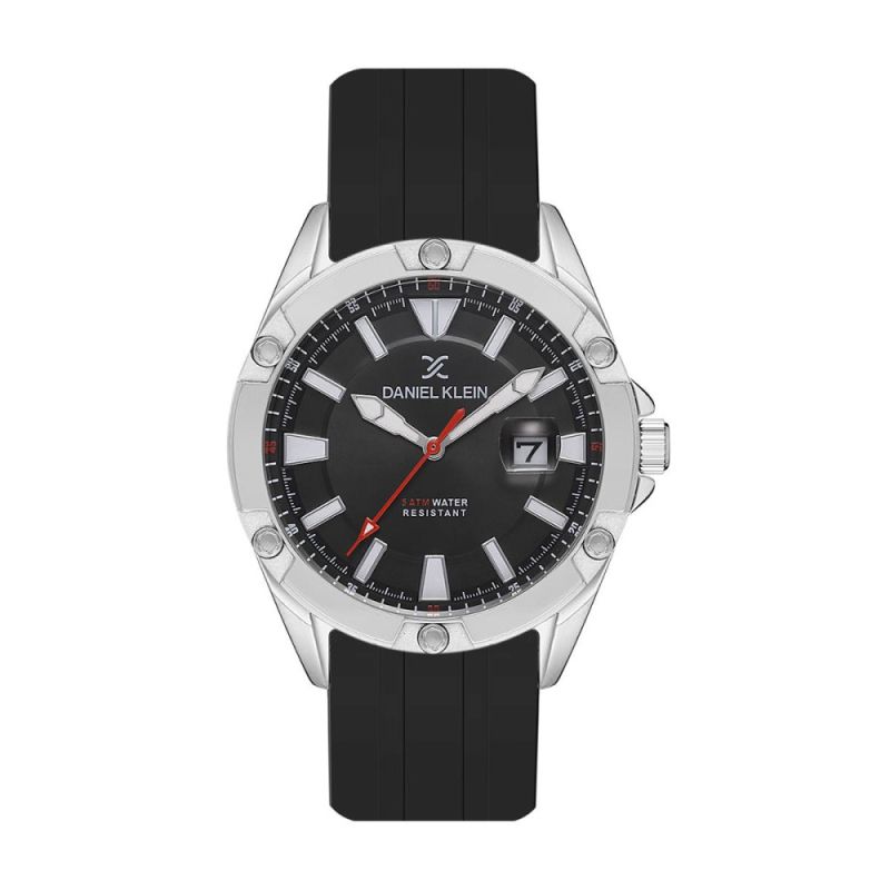 Мъжки часовник Daniel Klein със спортно-ежедневен дизайн от колекцията Premium. Аналогов дисплей с показател за дата. Стъкло минерал-кристал. Корпус изработен от висококачествена метална сплав, съчетан със силиконова каишка. Задвижва се от кварцов механизъм. Водоустойчивост 5 ATM - допускат се леки пръски и взимане на душ, не се препоръчва обилно мокрене.