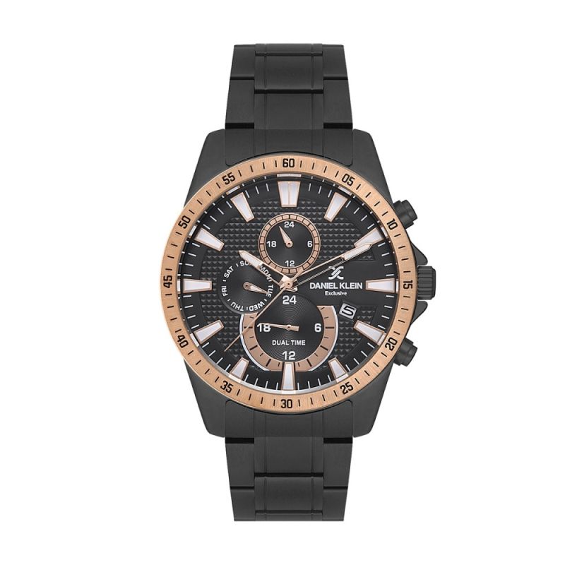 Мъжки часовник Daniel Klein със спортно-елегантен дизайн от колекцията Exclusive. Мултифункционален дисплей с показатели за дата, ден и двойно време. Стъкло минерал-кристал. Корпус изработен от висококачествена метална сплав. Верижка от неръждаема стомана. Задвижва се от кварцов механизъм. Водоустойчивост 5 ATM - допускат се леки пръски и взимане на душ, не се препоръчва обилно мокрене.