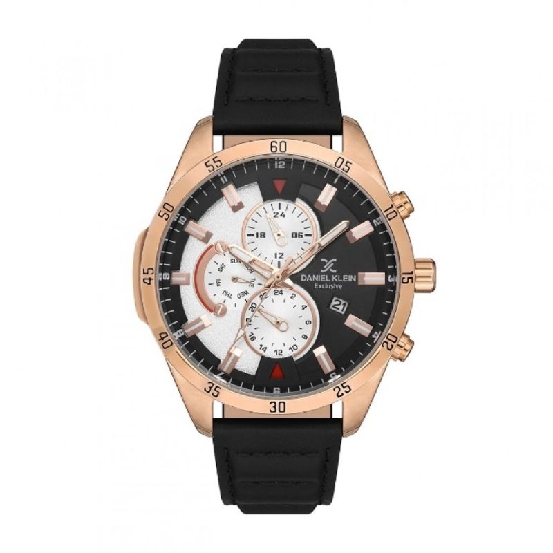 Спортно-елегантен мъжки часовник Daniel Klein от колекцията Exclusive. Моделът е с мултифункционален дисплей и стъкло минерал-кристал. Корпус изработен от висококачествена метална сплав. Черна каишка от естествена кожа. Задвижва се от кварцов механизъм. Водоустойчивост 5 ATM - допускат се леки пръски и взимане на душ, не се препоръчва обилно мокрене.