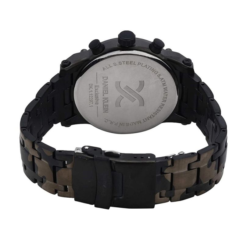 Мъжки часовник Daniel Klein от колекцията Exclusive. Корпус изработен от висококачествена метална сплав. Верижка от неръждаема стомана с камуфлажна шарка. Мултифункционален дисплей с показатели за ден, дата и двойно време. Стъкло минерал-кристал. Кварцов механизъм. Водоустойчивост 5 ATM - допускат се леки пръски и взимане на душ, не се препоръчва обилно мокрене.