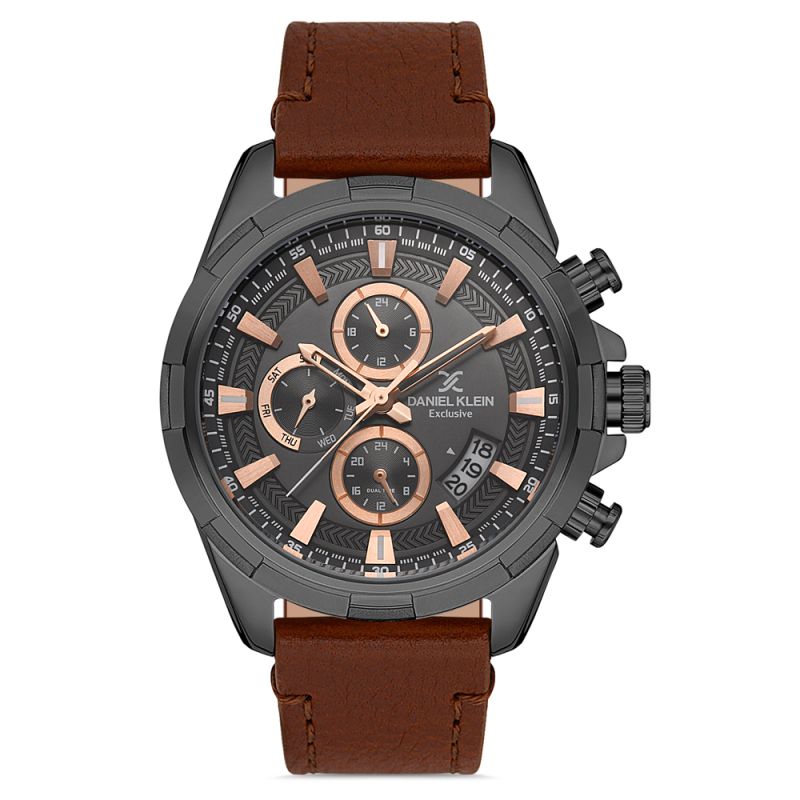 Мъжки часовник Daniel Klein от колекцията Exclusive. Корпус от метал. Кафява каишка от естествена кожа. Мултифункционален дисплей с минерално стъкло и показатели за дата, ден от седмицата и двойно време. Моделът се задвижва от кварцов механизъм. Водоустойчивост 5 ATM - допускат се леки пръски и взимане на душ, не се препоръчва обилно мокрене.