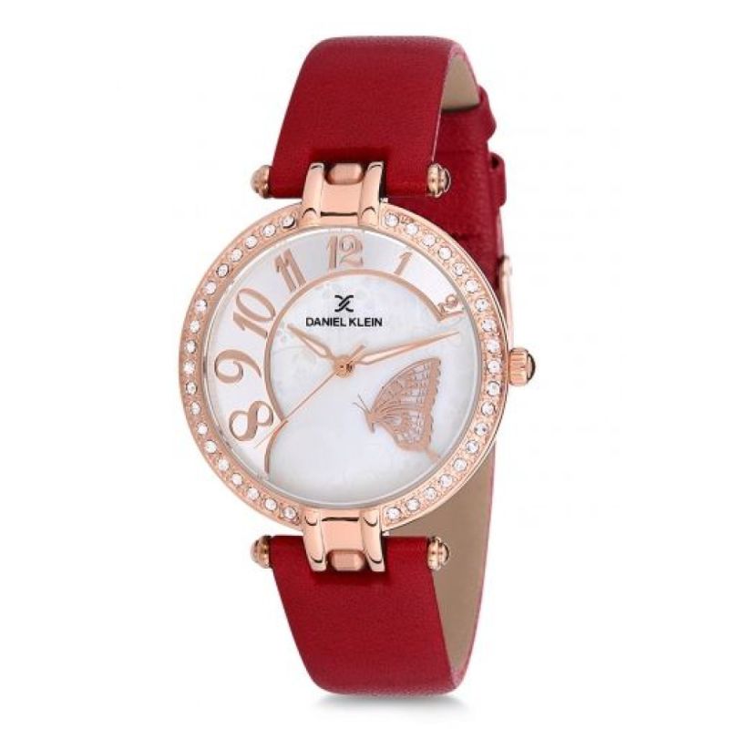 Дамски часовник Daniel Klein от колекцията Premium. Двупластов аналогов дисплей със седеф, декорация от стилизирана пеперуда и нежни кристали по ринга. Стъкло минерал-кристал. Корпус от висококачествена метална сплав. Червена каишка от естествена кожа. Кварцов механизъм. Водоустойчивост 3 ATM - допускат се леки пръски, не се препоръчва обилно мокрене.