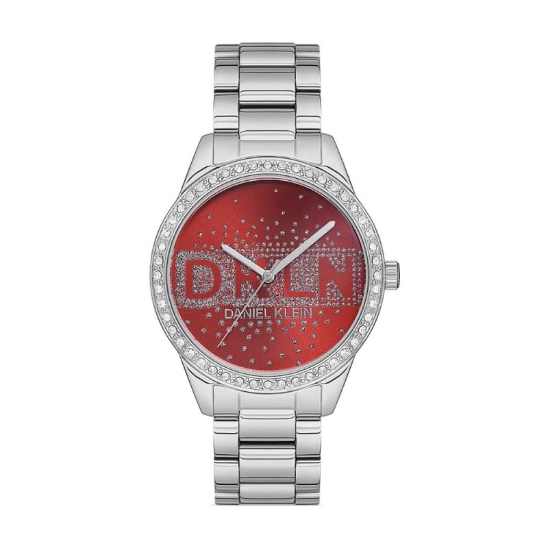Дамски часовник Daniel Klein с декорация от бляскави кристали. Моделът е с червен аналогов дисплей и стъкло минерал-кристал. Метален корпус, съчетан с верижка от неръждаема стомана. Часовникът се задвижва от кварцов механизъм. Водоустойчивост 3 ATM - допускат се леки пръски, не се препоръчва обилно мокрене.