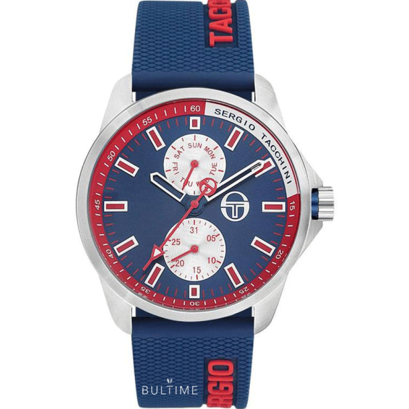 Мъжки часовник Sergio Tacchini с мултифункционален дисплей от колекцията Streamline. Минерално стъкло, устойчиво на надраскване. Корпус от неръждаема стомана в комбинация със силиконова каишка. Прецизен кварцов механизъм JS15 CITIZEN MIYOTA произведен в Япония. Водоустойчивост 5 ATM - допускат се леки пръски и взимане на душ, не се препоръчва обилно мокрене.