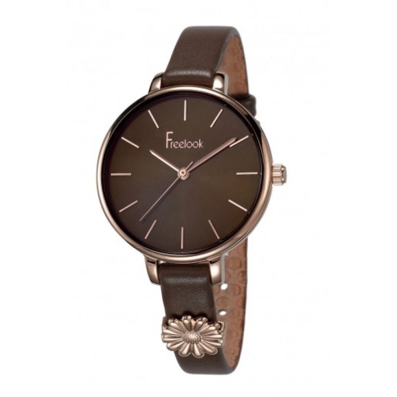 Дамски часовник Freelook от колекцията Eiffel. Корпус от неръждаема стомана. Кафява кожена каишка с декорация цвете. Стъкло минерал-кристал. Кварцов механизъм. Аналогов дисплей с изчистен дизайн. Водоустойчивост 3 ATM - допускат се леки пръски, не се препоръчва обилно мокрене.