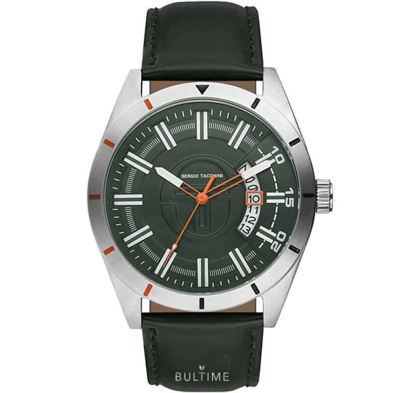 Мъжки часовник Sergio Tacchini със спортно-елегантен дизайн от колекцията Archivio. Аналогов дисплей с показател за дата. Фосфоресцентно покритие на стрелките и индексите. Корпус от неръждаема стомана, съчетан с каишка от естествена кожа. Стъкло минерал-кристал. Кварцов механизъм. Водоустойчивост 5 ATM - допускат се леки пръски и взимане на душ, не се препоръчва обилно мокрене.