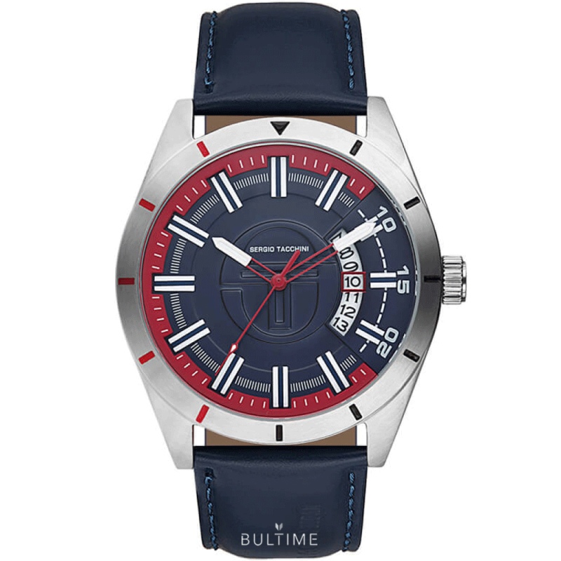 Мъжки часовник Sergio Tacchini със спортно-елегантен дизайн от колекцията Archivio. Аналогов дисплей с показател за дата. Фосфоресцентно покритие на стрелките и индексите. Корпус от неръждаема стомана, съчетан с каишка от естествена кожа. Стъкло минерал-кристал. Кварцов механизъм. Водоустойчивост 5 ATM - допускат се леки пръски и взимане на душ, не се препоръчва обилно мокрене.
