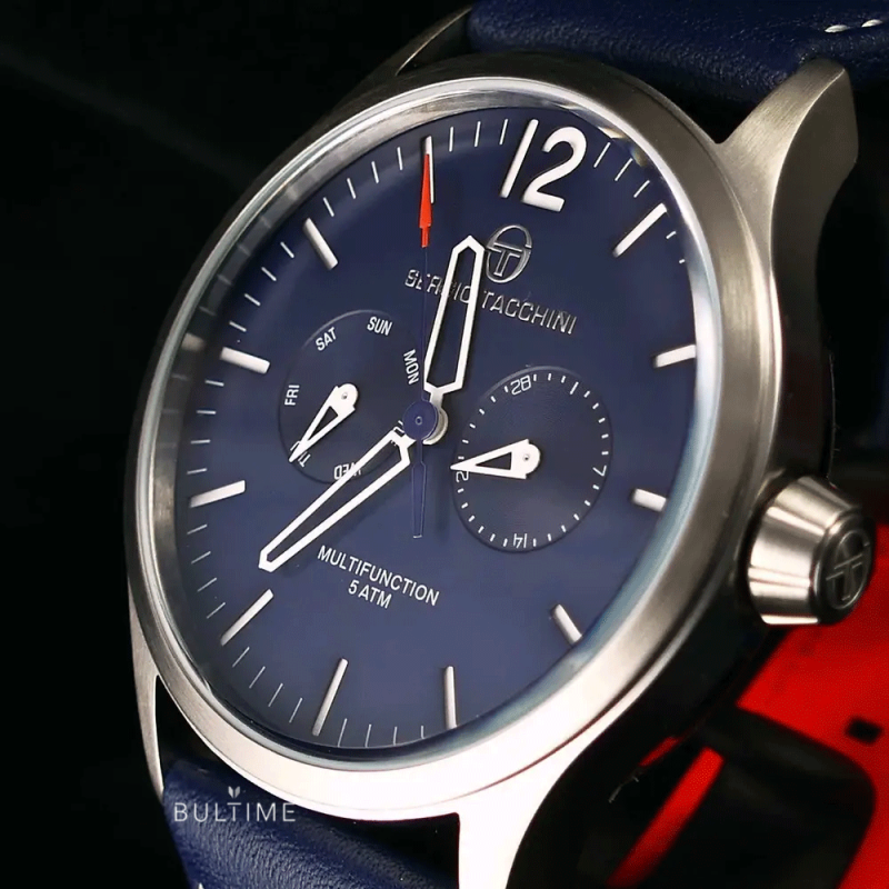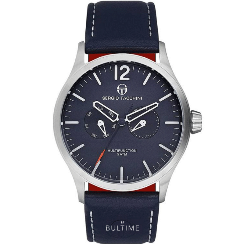 Спортно-елегантен мъжки часовник Sergio Tacchini с мултифункционален дисплей от колекциятаCity. Корпус от неръждаема стомана, съчетан с кожена каишка. Минерално стъкло, устойчиво на надраскване с антирефлексно покритие. Прецизен кварцов механизъм произведен в Япония. Водоустойчивост 5 ATM - допускат се леки пръски и взимане на душ, не се препоръчва обилно мокрене.