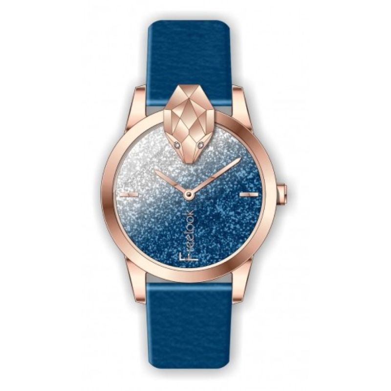 Дамски часовник Freelook от колекцията Belle с интересна визия. Моделът е с аналогов дисплей с бляскава основа и преливащ сиво-син цвят, декорация във формата на змийска глава на ринга. Синя каишка от естествена кожа. Метален корпус. Стъкло минерал-кристал. Кварцов механизъм. Водоустойчивост 5 ATM - допускат се леки пръски и взимане на душ, не се препоръчва обилно мокрене.