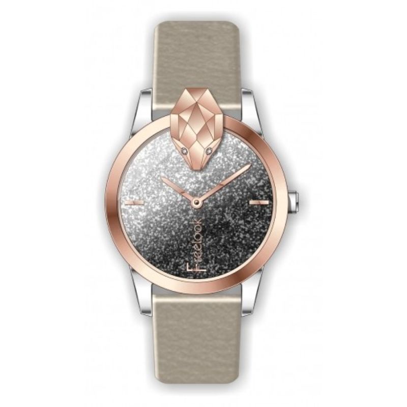 Дамски часовник Freelook от колекцията Belle с интересна визия. Моделът е с аналогов дисплей с бляскава основа и преливащ сиво-черен цвят, декорация под формата на змийска глава на ринга. Каишка от естествена кожа в бежов цвят. Метален корпус. Стъкло минерал-кристал. Кварцов механизъм. Водоустойчивост 5 ATM - допускат се леки пръски и взимане на душ, не се препоръчва обилно мокрене.