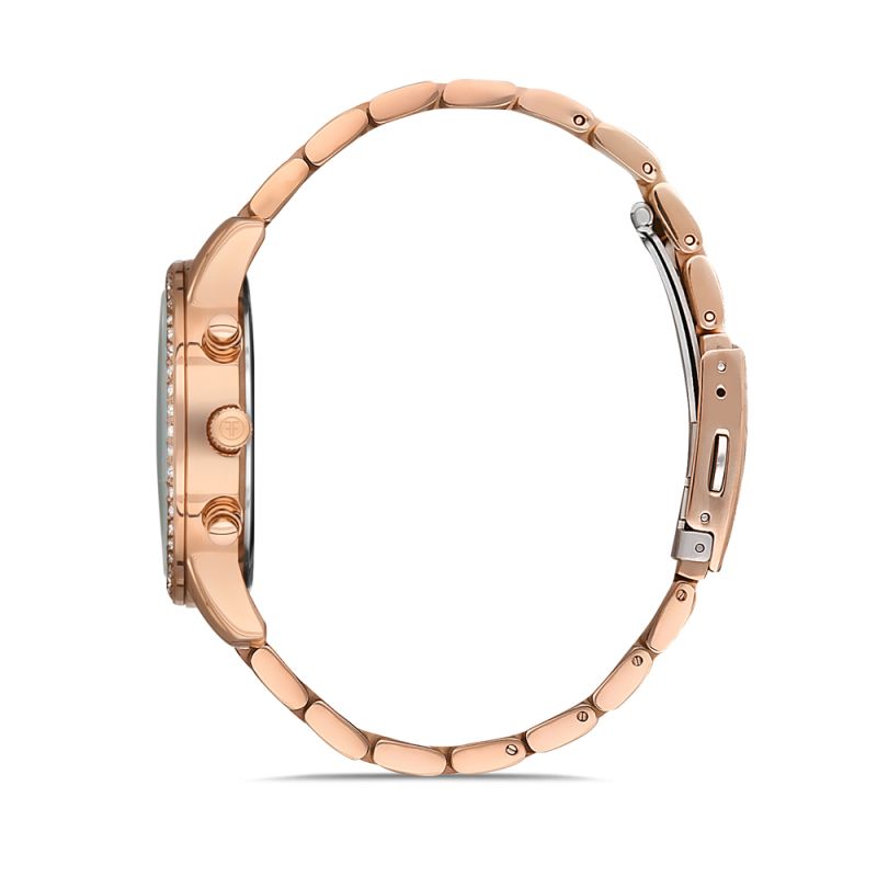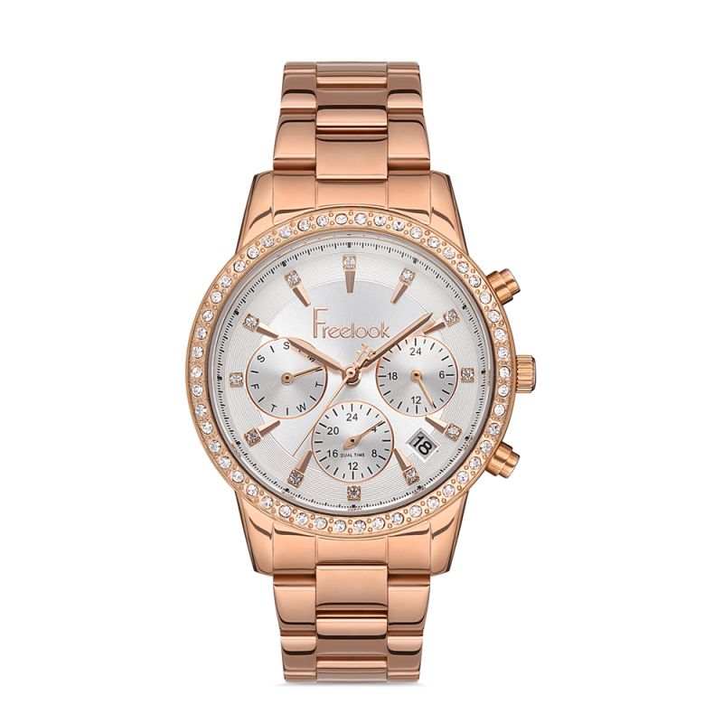 Дамски часовник Freelook от колекцията Belle в нежен розово-златист цвят с декорация от инкрустирани кристали. Моделът е с мултифункционален дисплей. Корпус от месинг. Стъкло минерал-кристал. Верижка от неръждаема