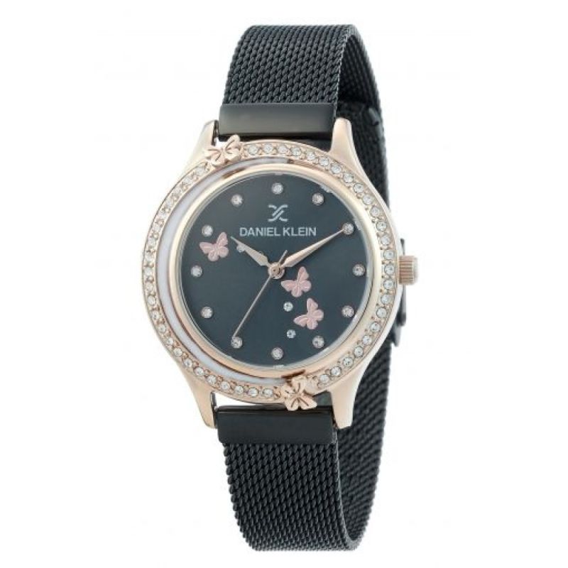 Дамски часовник Daniel Klein с декорация от инкрустирани кристали и  нежни пеперуди. Моделът е с корпус от висококачествена метална сплав и верижка от неръждаема стомана. Стъкло минерал-кристал. Кварцов механизъм. Водоустойчивост 3 ATM - допускат се леки пръски, не се препоръчва обилно мокрене.