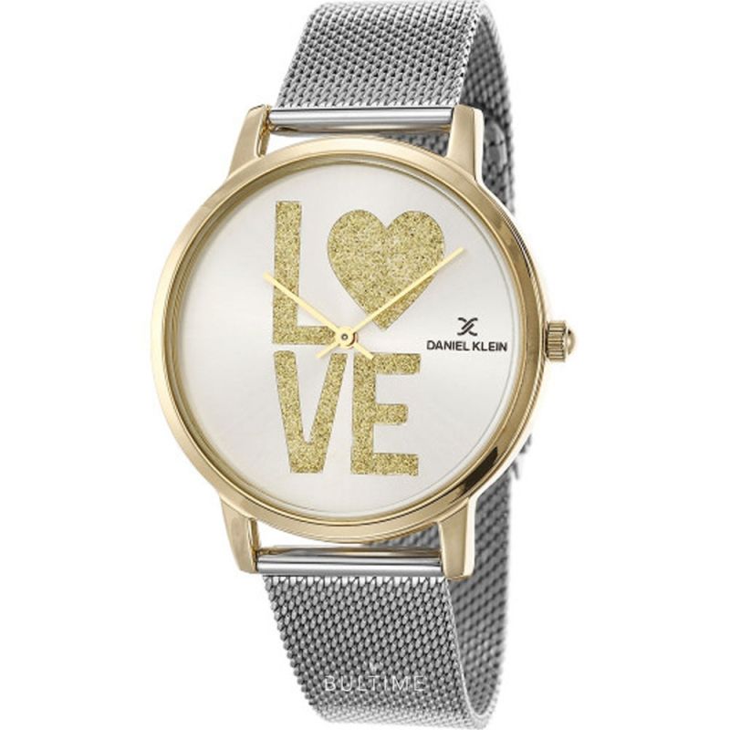 Дамски часовник Daniel Klein от колекцията Trendy. Моделът е с аналогов дисплей с бляскави детайли изписащи думата “LOVE”. Стъкло минерал-кристал. Корпус изработен от висококачествена метална сплав. Верижка ситна плетка от неръждаема стомана. Задвижва се от кварцов механизъм. Водоустойчивост 3 ATM - допускат се леки пръски, не се препоръчва обилно мокрене.