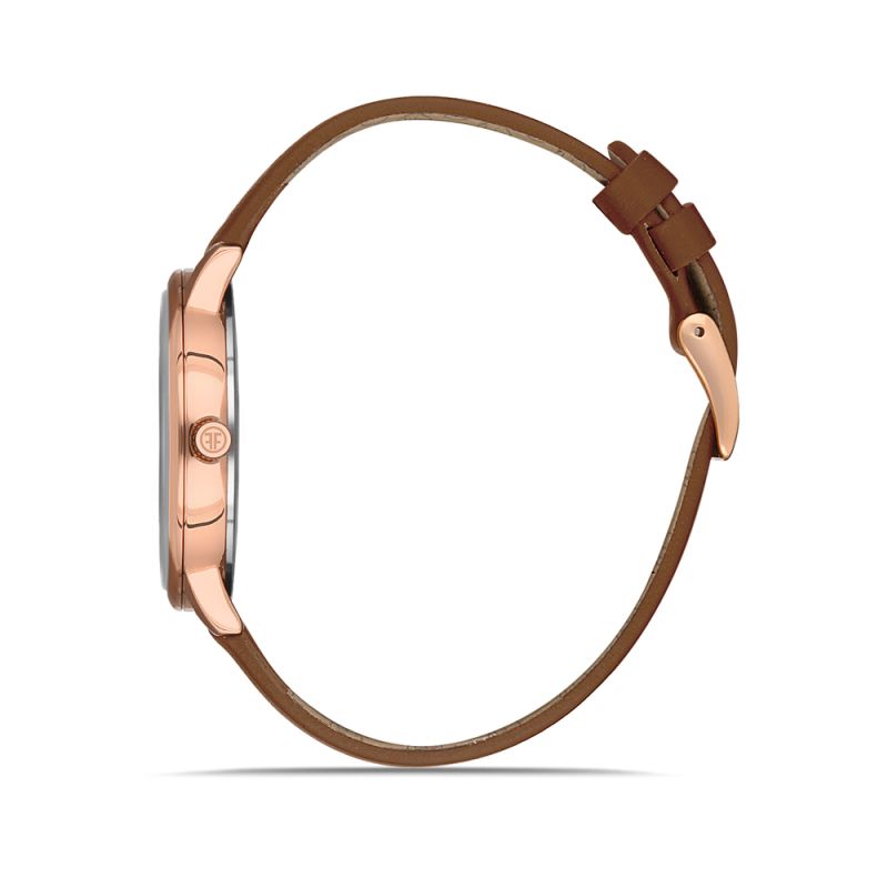 стъкло. Кафява кожена каишка. Стилен циферблат в сив цвят с