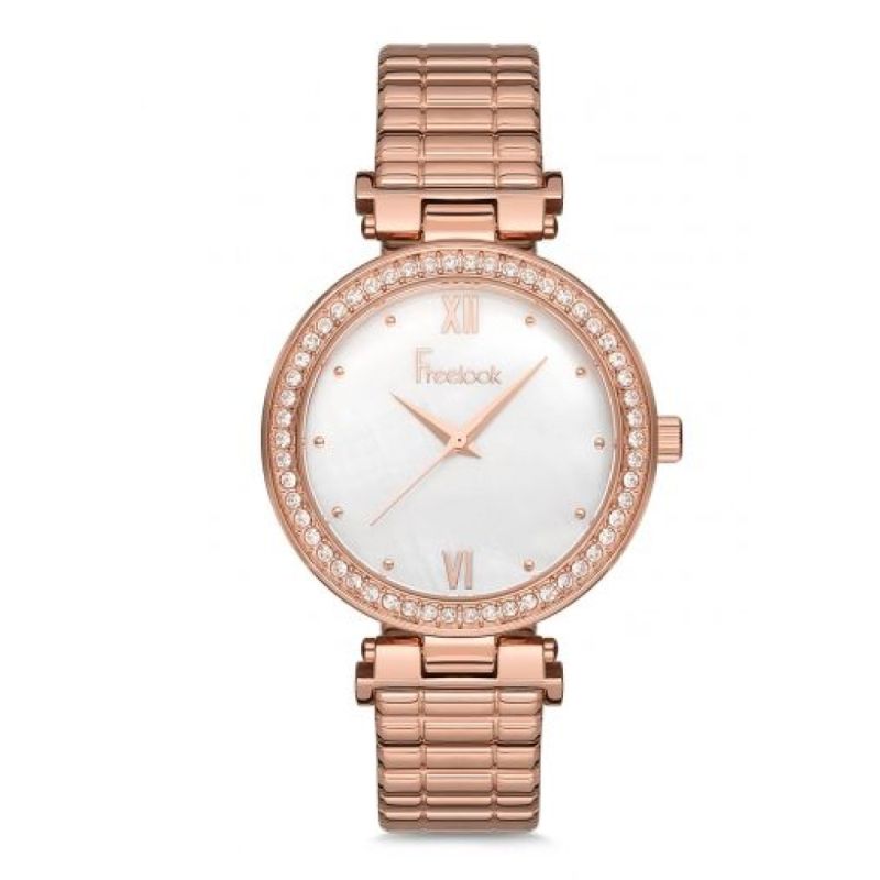 Дамски часовник Freelook с декорация от инкрустирани кристали от колекцията Swarovski Elements. Моделът е с корпус и верижка от неръждаема стомана. Стъкло минерал-кристал. Седефен аналогов дисплей. Кварцов механизъм. Водоустойчивост 3 ATM - допускат се леки пръски, не се препоръчва обилно мокрене.