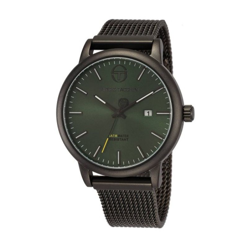 Мъжки часовник Sergio Tacchini от колекцията Streamline. Моделът е с тъмнозелен аналогов дисплей с показател за дата. Корпус от висококачествена метална сплав. Черна верижка от неръждаема стомана. Стъкло минерал-кристал. Задвижва се от кварцов механизъм. Водоустойчивост 5 ATM - допускат се леки пръски и взимане на душ, не се препоръчва обилно мокрене.