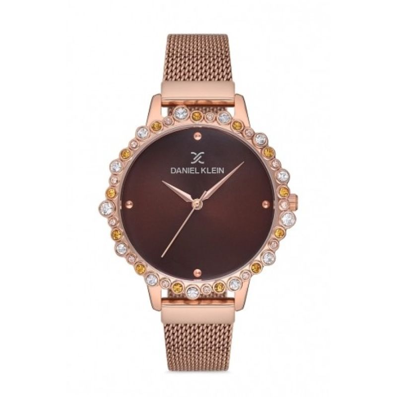 Дамски часовник Daniel Klein с модерен дизайн от колекцията Trendy. Моделът е с кафяв аналогов дисплей и декорация от кристали по ринга. Стъкло минерал-кристал. Метален корпус, съчетан с верижка от неръждаема стомана. Кварцов механизъм. Водоустойчивост 3 ATM - допускат се леки пръски, не се препоръчва обилно мокрене.