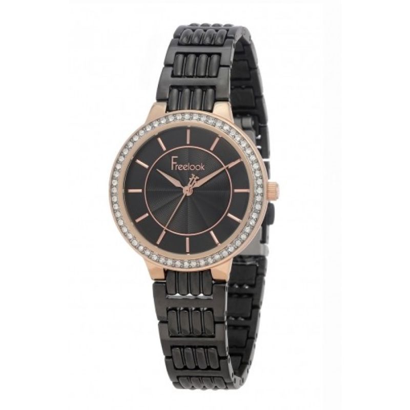 Дамски часовник Freelook от колекцията Lumiere с декорация от нежни кристали. Моделът е с метален корпус и има минерално стъкло. Верижка от неръждаема стомана в черен цвят. Аналогов дисплей. Кварцов механизъм. Водоустойчивост 5 ATM - допускат се леки пръски и взимане на душ, не се препоръчва обилно мокрене.