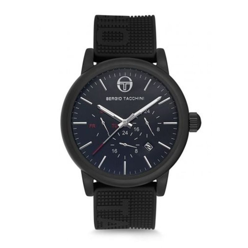 Мъжки часовник Sergio Tacchini от колекцията City Dual Time. Моделът е с корпус от неръждаема стомана и силиконова каишка. Мултифункционален дисплей с показатели за дата, ден и двойно време. Стъкло минерал-кристал. Задвижва се от кварцов механизъм. Водоустойчивост 5 ATM - допускат се леки пръски и взимане на душ, не се препоръчва обилно мокрене.
