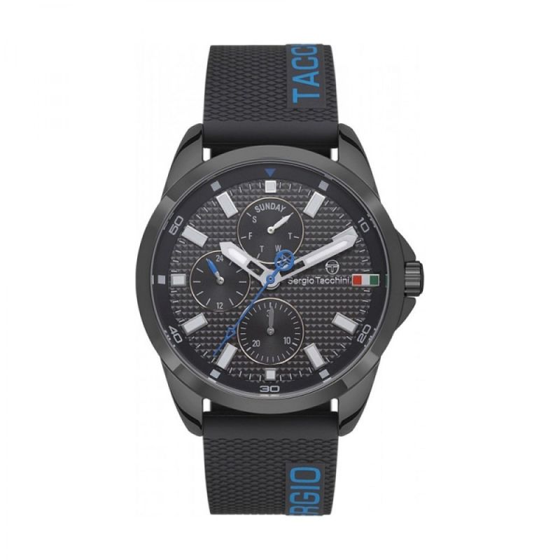 Спортен модел мъжки часовник Sergio Tacchini с мултифункционален дисплей. Корпус от неръждаема стомана в комбинация със силиконова каишка. Луминисцентно покритие на стрелките и индексите. Минерално стъкло, устойчиво на надраскване. Кварцов механизъм. Водоустойчивост 5 ATM - допускат се леки пръски и взимане на душ, не се препоръчва обилно мокрене.