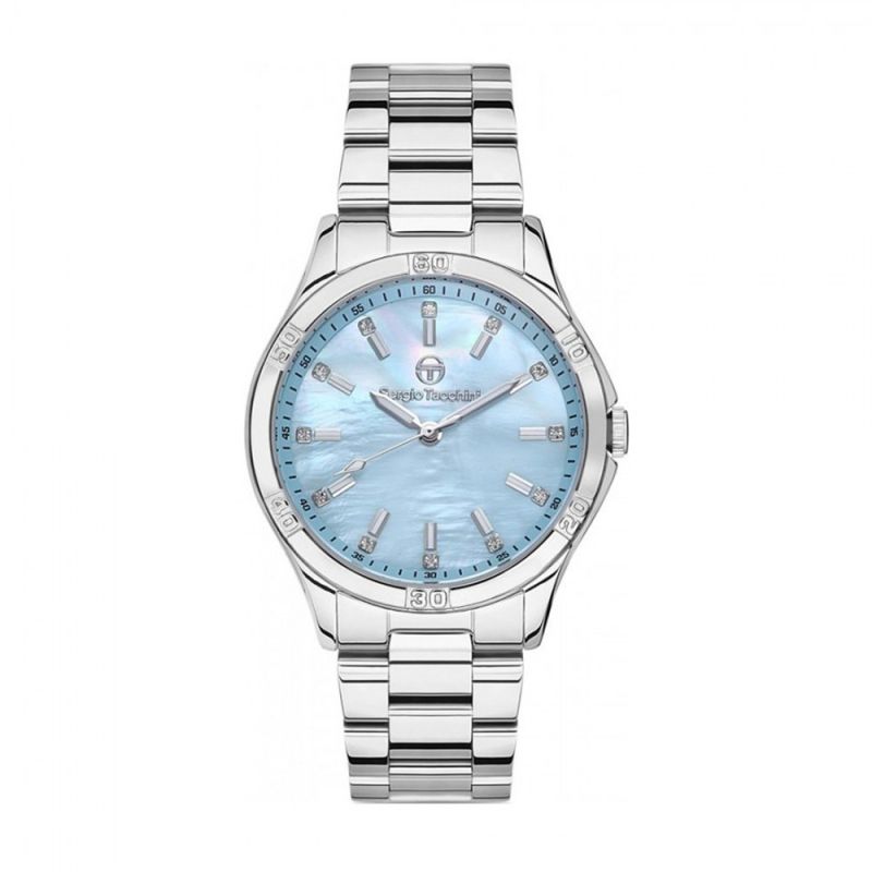Класически модел дамски часовник Sergio Tacchini с елегантен дизайн от колекцията Archivio. Часовникът е със стилен седефен циферблат, украсен с нежни кристали. Луминисцентно покритие на стрелките и индексите. Корпус и верижка изработени от неръждаема стомана. Задвижва се от кварцов механизъм. Водоустойчивост 5 ATM - допускат се леки пръски и взимане на душ, не се препоръчва обилно мокрене.