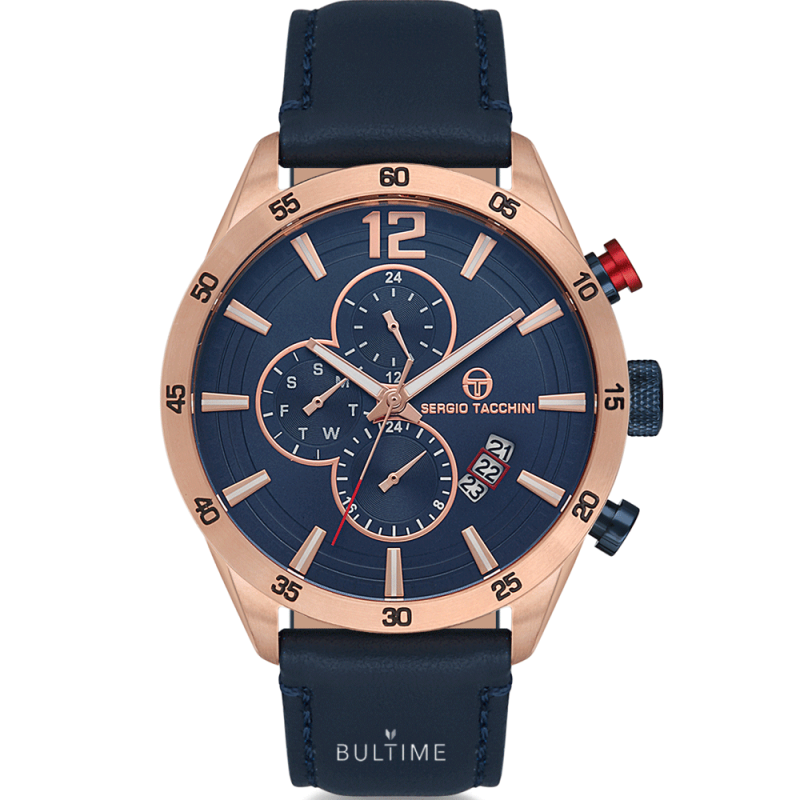Мъжки часовник Sergio Tacchini със спортно-елегантен дизайн от колекцията Archivio Dual Time. Корпус от неръждаема стомана. Синя каишка от естествена кожа. Мултифункционален дисплей с показатели за дата, ден и двойно време. Фосфоресцентно покритие на стрелките и индексите. Минерално стъкло, устойчиво на надраскване с антирефлексно покритие. Прецизен кварцов механизъм произведен в Япония. Водоустойчивост 10 ATM - позволява мокрене, къпане и плуване във водни басейни.