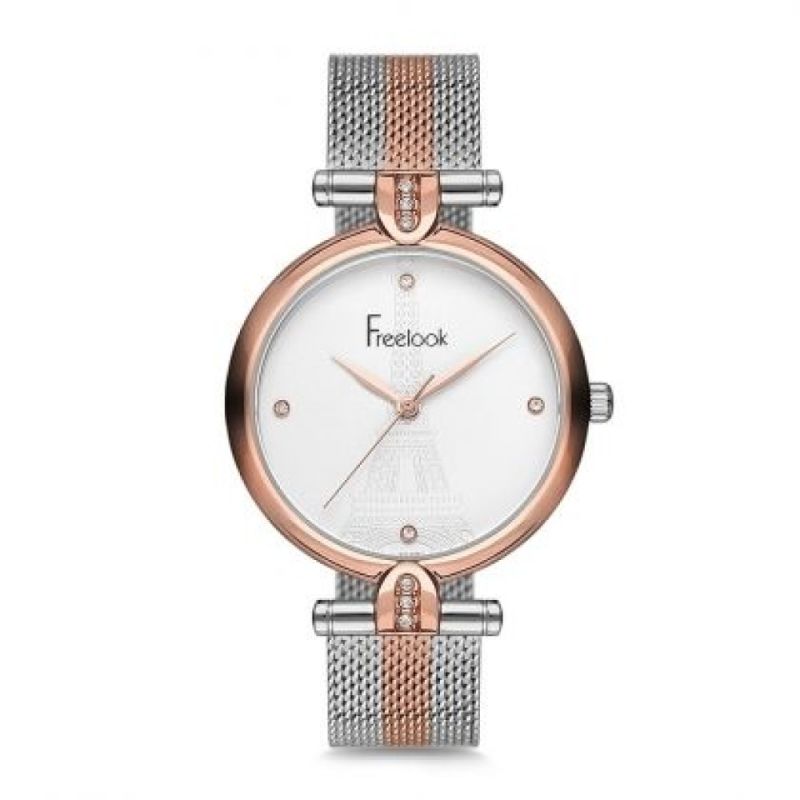 Дамски часовник Freelook с модерен и нежен дизайн от колекцията Eiffel. Моделът е с корпус и верижка от неръждаема стомана. Стъкло минерал-кристал. Аналогов дисплей с декорация във формата на Айфеловата кула, допълнена от инкрустирани кристали. Кварцов механизъм. Водоустойчивост 3 ATM - допускат се леки пръски, не се препоръчва обилно мокрене.