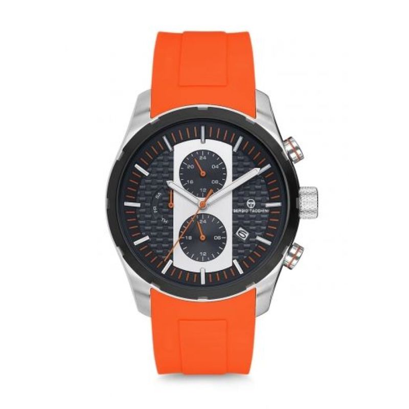 Мъжки часовник Sergio Tacchini от колекцията Archivio Dual Time. Моделът е с тъмносив мултифункционален дисплей с оранжеви детайли. Корпус от неръждаема стомана, съчетан със силиконова каишка. Стъкло минерал-кристал. Задвижва се от кварцов механизъм. Водоустойчивост 10 ATM - позволява мокрене, къпане и плуване във водни басейни.