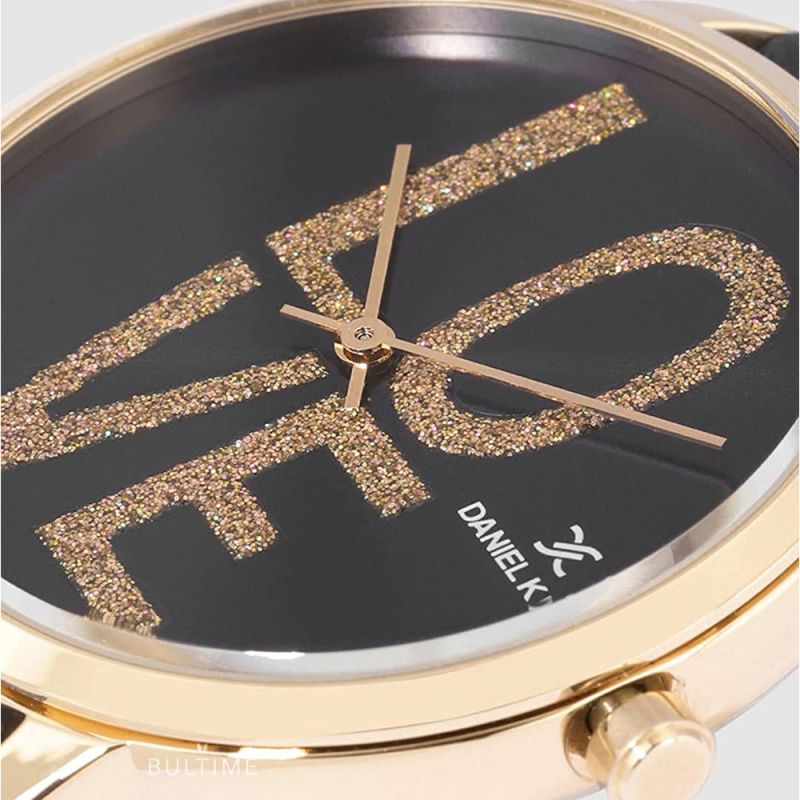 Дамски часовник Daniel Klein от колекцията Trendy. Моделът е с аналогов дисплей с бляскав надпис LOVE. Стъкло минерал-кристал. Корпус изработен от висококачествена метална сплав. Каишка от естествена кожа. Задвижва се от кварцов механизъм. Водоустойчивост 3 ATM - допускат се леки пръски, не се препоръчва обилно мокрене.