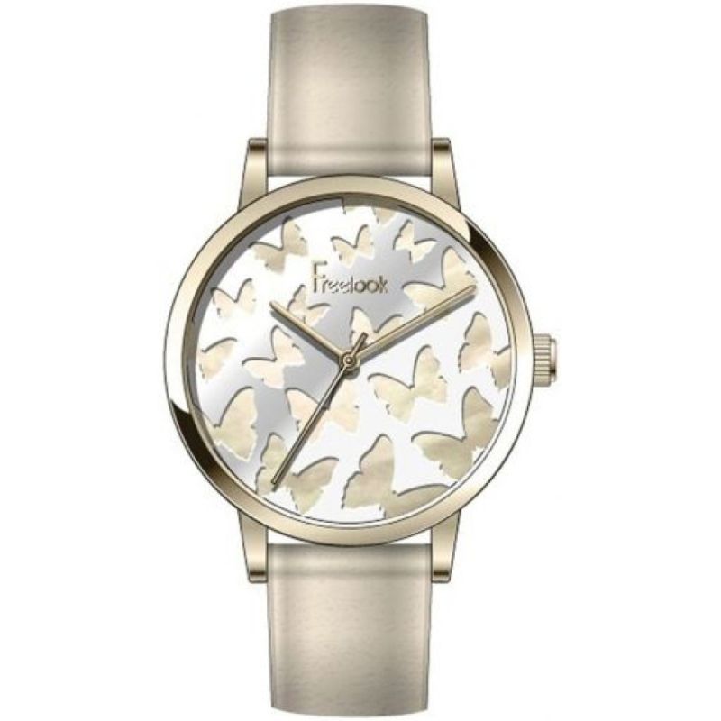 Дамски часовник Freelook с нежен и интересен дизайн от колекцията Eiffel. Моделът е с корпус от неръждаема стомана и каишка от естествена кожа. Стъкло минерал-кристал. Аналогов седефен дисплей с декорация от пеперуди. Кварцов механизъм. Водоустойчивост 3 ATM - допускат се леки пръски, не се препоръчва обилно мокрене.