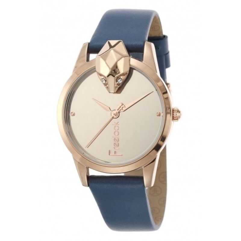 Дамски часовник Freelook с интересна визия от колекцията Belle. Синя кожена каишка. Метален корпус.