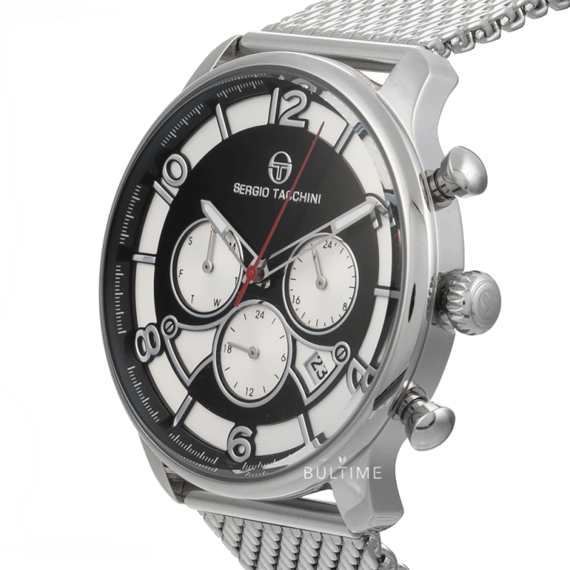 Мъжки часовник Sergio Tacchini със спортно-елегантна визия от колекцията Archivio Dual Time. Моделът е с мултифункционален дисплей с показатели за дата, ден и двойно време. Стъкло минерал-кристал с антирефлексно покритие. Корпус и верижка ситна плетка изработени от неръждаема стамана. Задвижва се от кварцов механизъм.  Водоустойчивост 5 ATM - допускат се леки пръски и взимане на душ, не се препоръчва обилно мокрене.