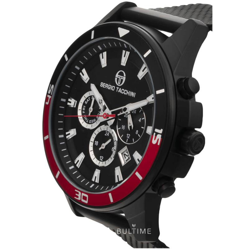 Мъжки часовник Sergio Tacchini с мултифункционален дисплей. Корпус и верижка ситна плетка, изработени от неръждаема стомана. Минерално стъкло, устойчиво на надраскване. Задвижва се от кварцов механизъм. Водоустойчивост 5 ATM - допускат се леки пръски и взимане на душ, не се препоръчва обилно мокрене.