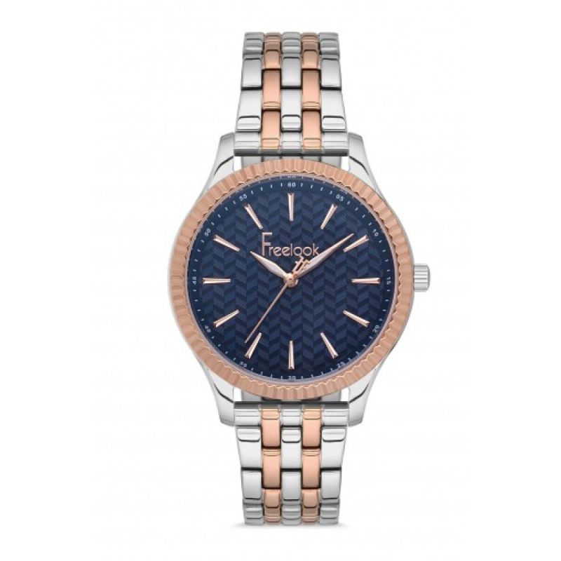 Дамски часовник Freelook от колекцията Eiffel. Моделът е с корпус от месинг и е с минерално стъкло. Верижка от неръждаема стомана. Аналогов дисплей в тъмносин цвят с текстурирана основа. Кварцов механизъм. Водоустойчивост 5 ATM - допускат се леки пръски и взимане на душ, не се препоръчва обилно мокрене.
