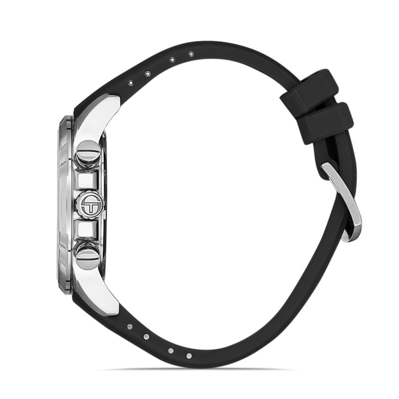 Мъжки часовник Sergio Tacchini със спортна и модерна визия от колекцията Archivio. Корпус изработен от неръждаема стомана. Черна силиконова каишка. Мултифункционален дисплей с минерално стъкло и показатели за дата, ден от седмицата и двойно време. Кварцов механизъм. Водоустойчивост 5 ATM - допускат се леки пръски и взимане на душ, не се препоръчва обилно мокрене.