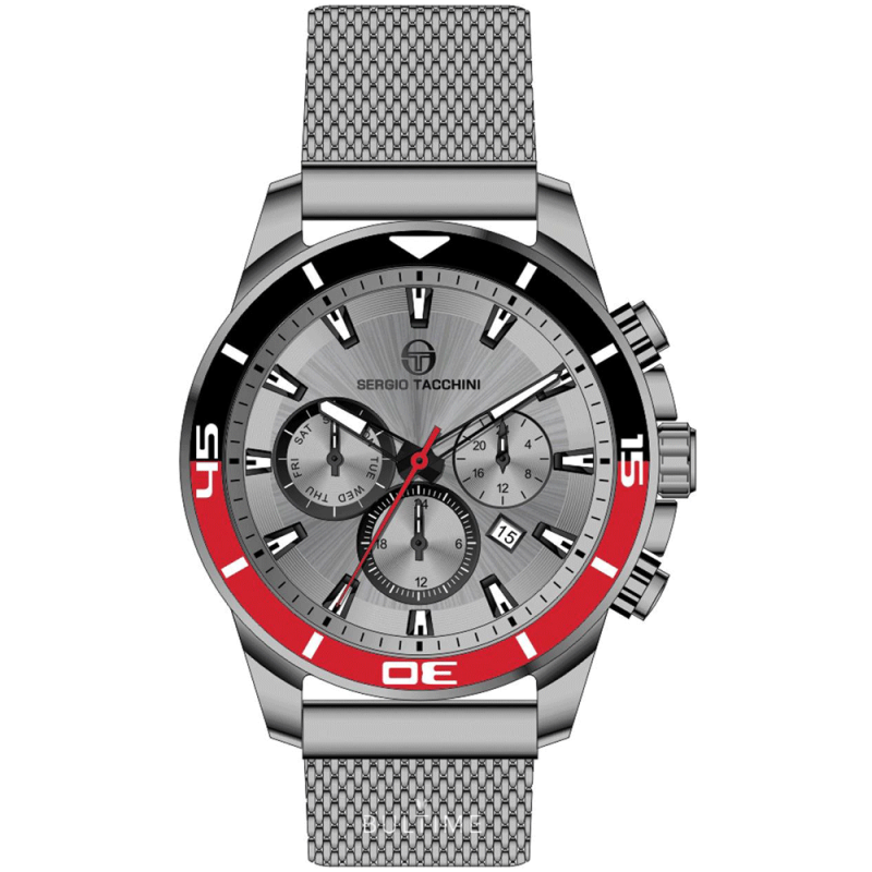 Мъжки часовник Sergio Tacchini с мултифункционален дисплей. Корпус и верижка ситна плетка, изработени от неръждаема стомана. Минерално стъкло, устойчиво на надраскване. Задвижва се от кварцов механизъм. Водоустойчивост 5 ATM - допускат се леки пръски и взимане на душ, не се препоръчва обилно мокрене.
