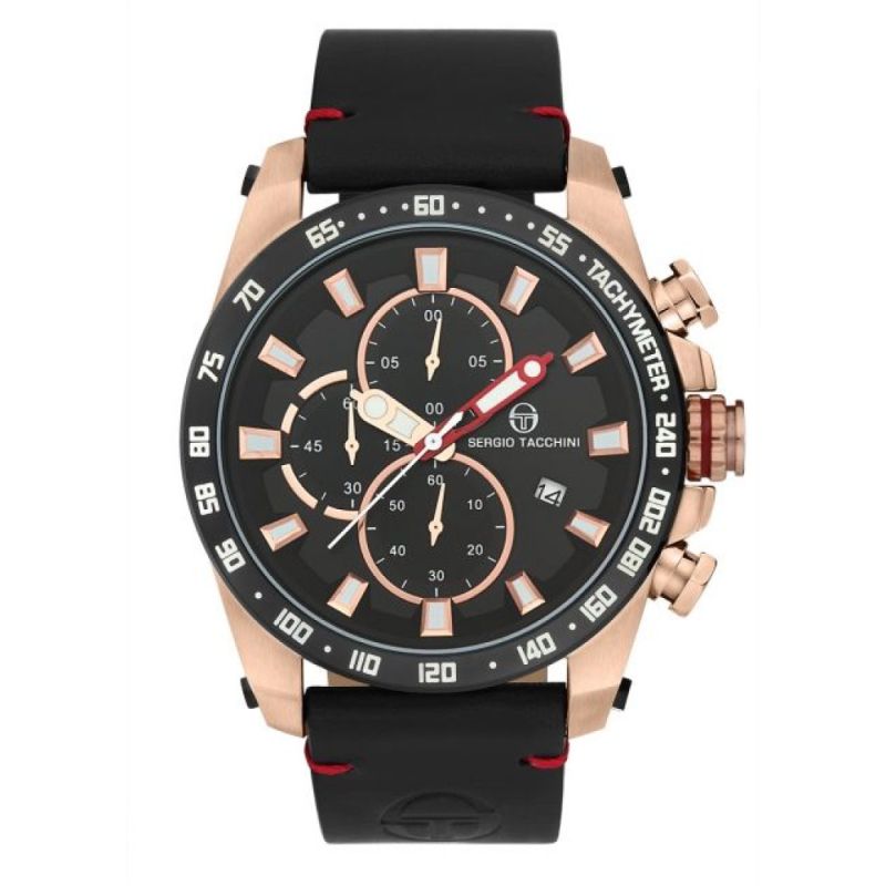 Мъжки часовник Sergio Tacchini със спортно-елегантен дизайн от колекцията Archivio Chronograph. Моделът е с дисплей хронограф (точност 1/10 от секундата и максимално измервано време 60 минути). Фосфоресцентно покритие на стрелките и индексите. Минерално стъкло, устойчиво на надраскване. Корпус от неръждаема стомана, съчетан с каишка от естествена кожа. Прецизен кварцов механизъм VD57 SEIKO HATTORI произведен в Япония. Водоустойчивост 5 ATM - допускат се леки пръски и взимане на душ, не се препоръчва обилно мокрене.