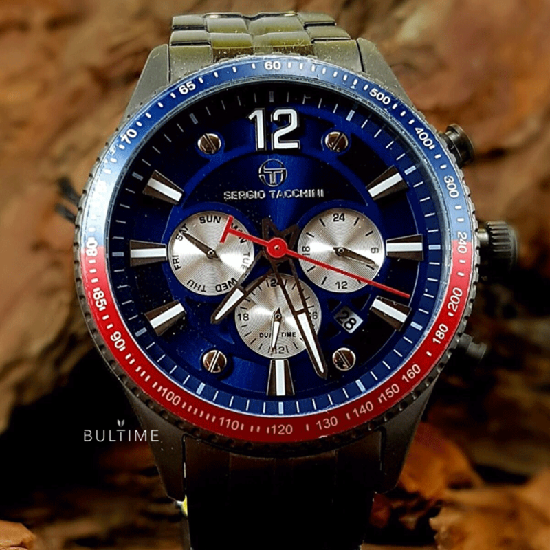 Мъжки часовник Sergio Tacchini от колекцията Archivio Dual Time. Мултифункционален дисплей с показатели за дата, ден и двойно време. Корпус и верижка от неръждаема стомана. Задвижва се от кварцов механизъм. Водоустойчивост 5 ATM - допускат се леки пръски и взимане на душ, не се препоръчва обилно мокрене.