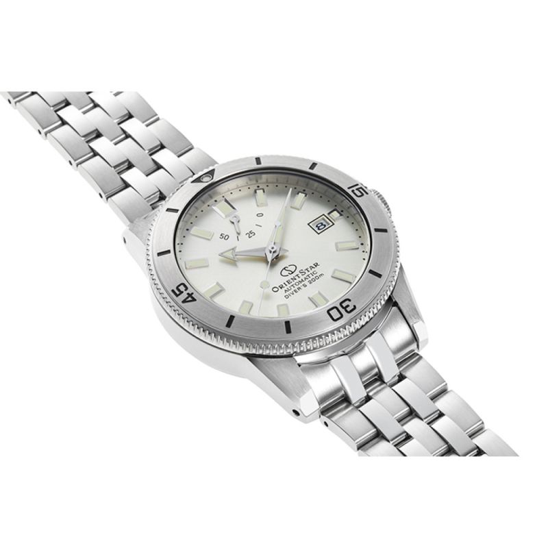 Мъжки часовник Orient Star с модерен спортнен дизайн. Моделът е с корпус и верижка от неръждаема стомана. Сребрист аналогов дисплей с показател за дата и индикатор за резервната мощност. Фосфорисциращи стрелки и индекси. Сапфирено стъкло с антрирефлексно покритие. Задвижва се от автоматичен механизъм F6N47 с резервна мощност 50 часа. Водоустойчивост 20 ATM - позволява мокрене, къпане, плуване и гмуркане във водни басейни.