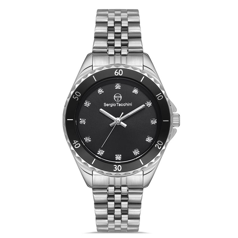 Дамски часовник Sergio Tacchini с нежна и модерна визия от колекцията Archivio. Моделът е с корпус и верижка от неръждаема стомана. Черен циферблат с декорация от инкрустирани кристали на часовите маркери. Кварцов механизъм. Водоустойчивост 5 ATM - допускат се леки пръски и взимане на душ, не се препоръчва обилно мокрене.