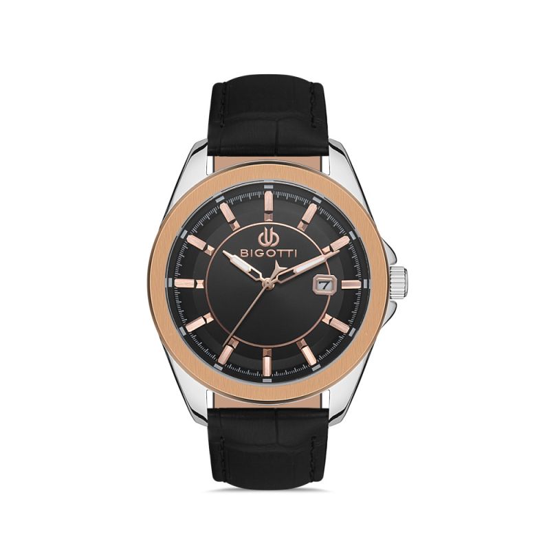 Спортно-елегантен мъжки часовник Bigotti от колекцията Milano. Моделът е с черен аналогов дисплей с показател за дата. Луминисцентно покритие на стрелките и индексите. Минерално стъкло, устойчиво на надраскване. Метален корпус съчетан с каишка от естествена кожа. Часовникът се задвижва от кварцов механизъм. Водоустойчивост 5 ATM - допускат се леки пръски и взимане на душ, не се препоръчва обилно мокрене.